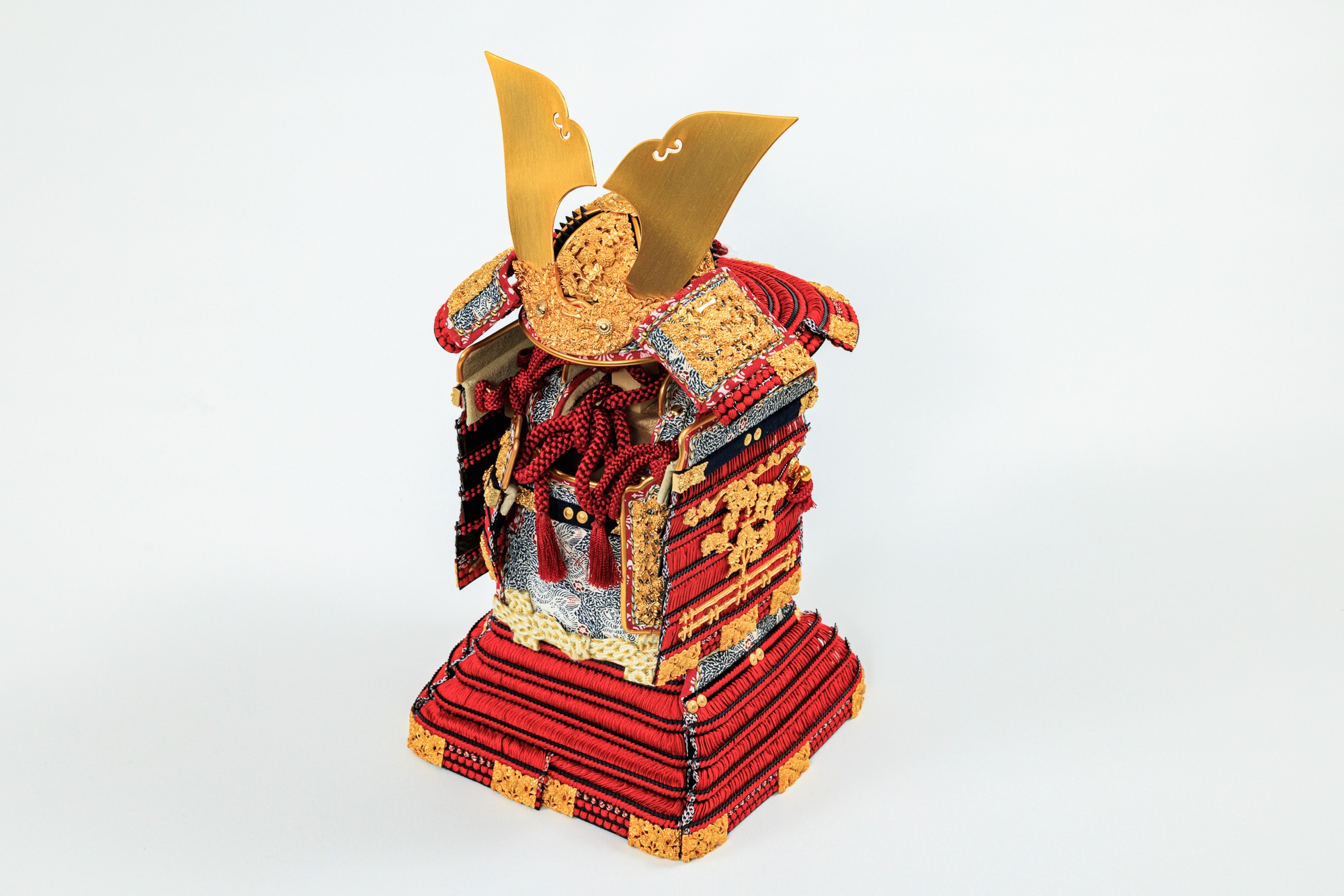 目をひく赤い縅に繊細な金具がたくさん施されています。