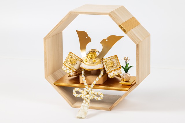 インテリアにも馴染む 八角飾り 軽量桐材(無垢)を使用しております 国産の兜は 白とゴールドを基調とし 鉢部分もプラスチック製ではない本格派です クリアフラワーの菖蒲は mikotoオリジナル 独特の硬質感がお飾りに彩を添えております ハタキ/手袋のお手入れsetは付属しております サイズ 口26cm×奥行12cm×高さ26cm 一部受注生産につき 発送はご注文から約3週間後となります 兜:金属製本格兜 飾り台:八角台 木製 ゴールドライン 中板 花:18号 菖蒲 ゴールド 場を清め幸を招く宝来鈴付