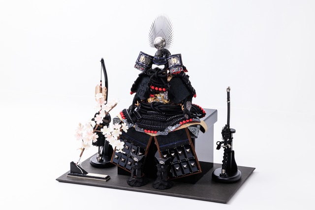 間口50cm×奥行30cm SK07 織田信長鎧 mikotoオリジナルの漆黒の織田鎧 ポイントに桜を配置しました 仕様 兜:鎧 織田信長モデル 飾り台:50×30 こと 革黒 お花:うらら M桜 黒台 SPL 弓太刀:10号 黒龍 ※お手入れセット(白手袋、毛バタキ)プレゼント
