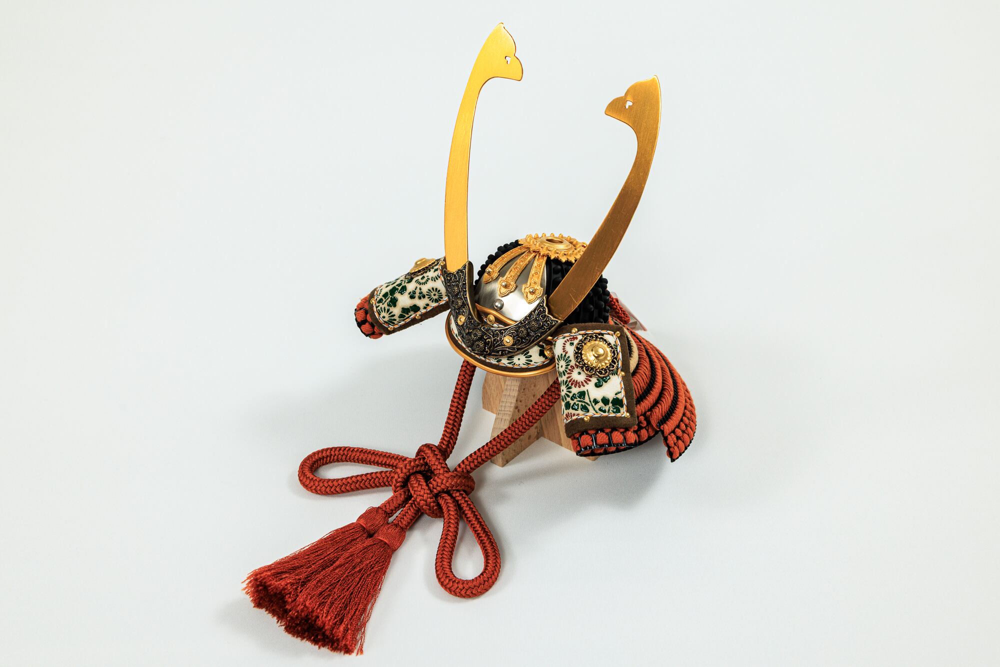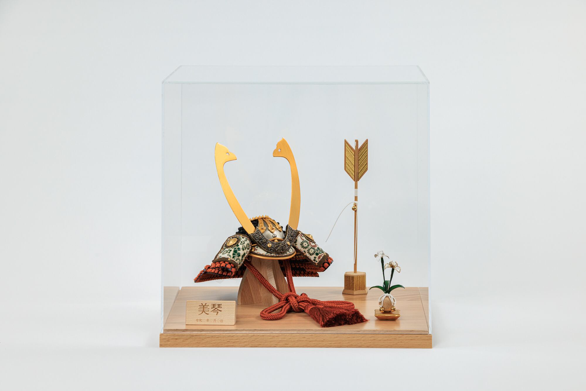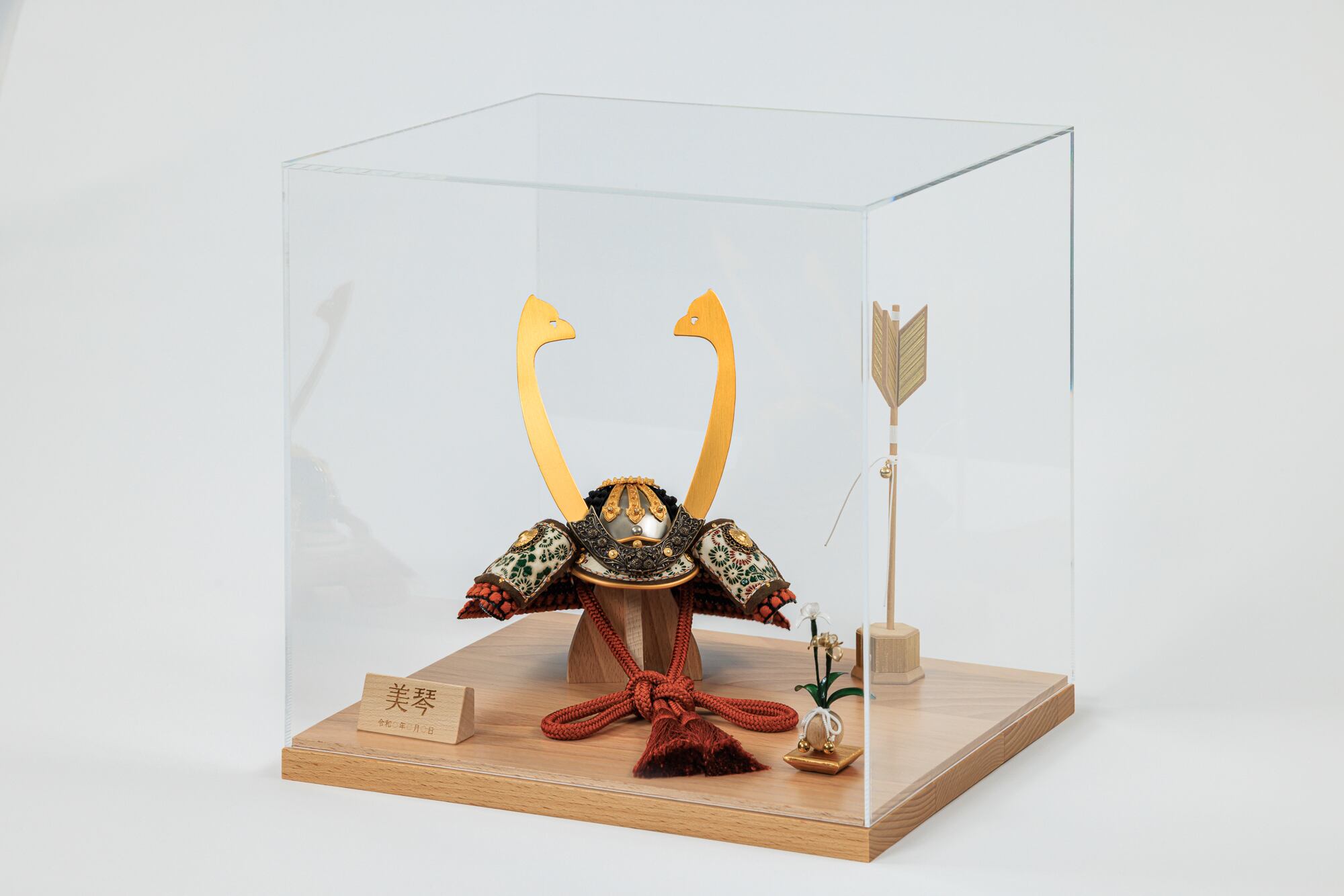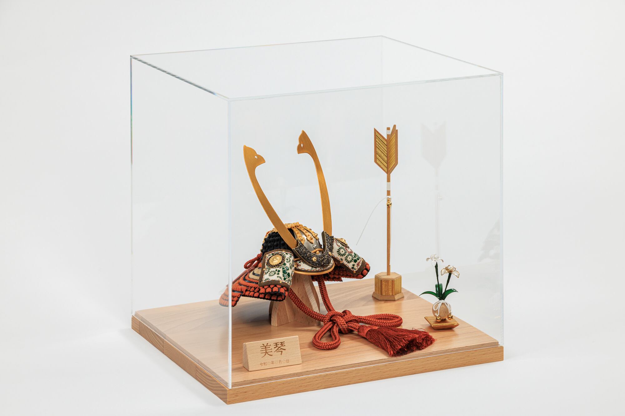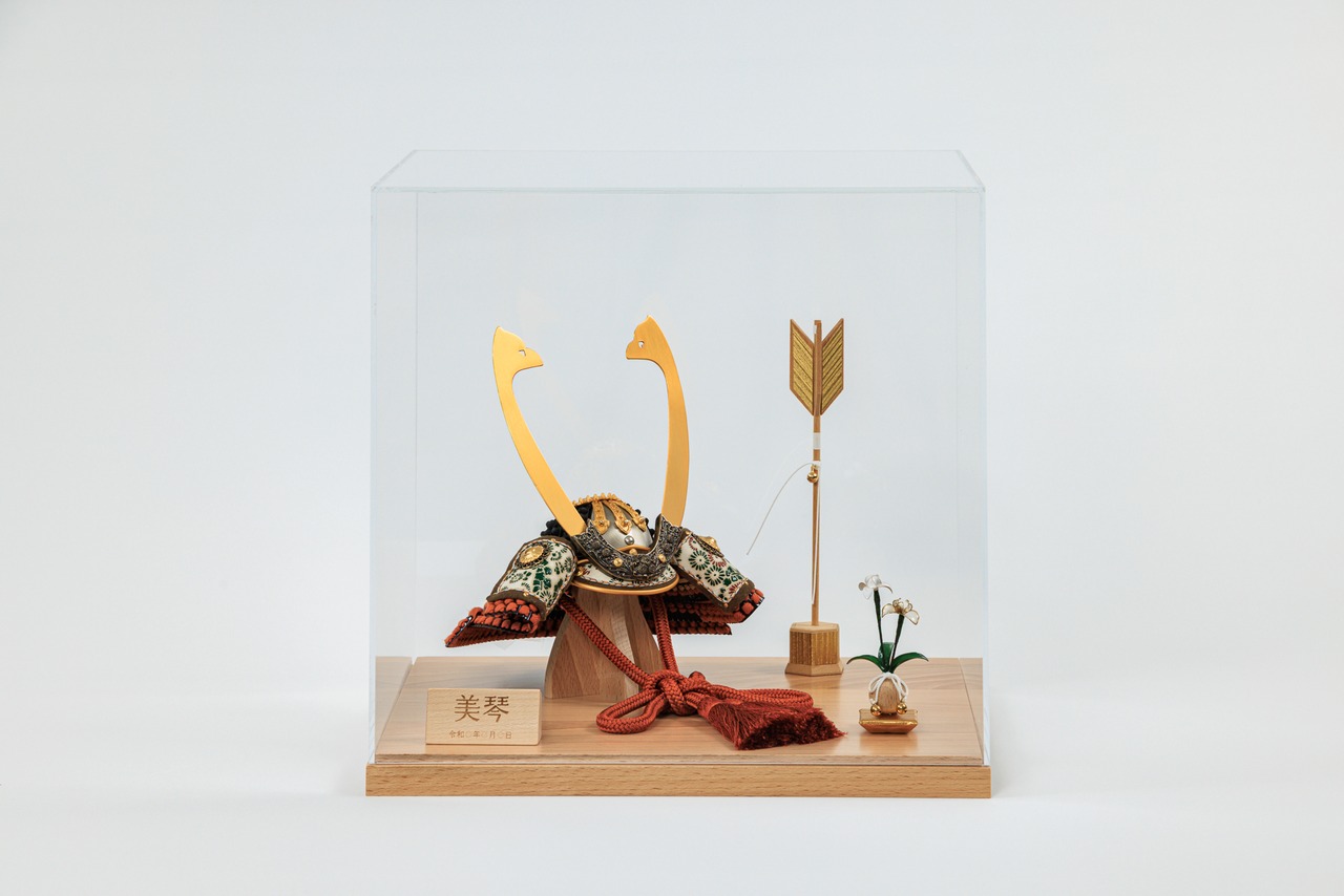 長鍬形が印象的な茶色の兜をコンパクトなケース飾りで!