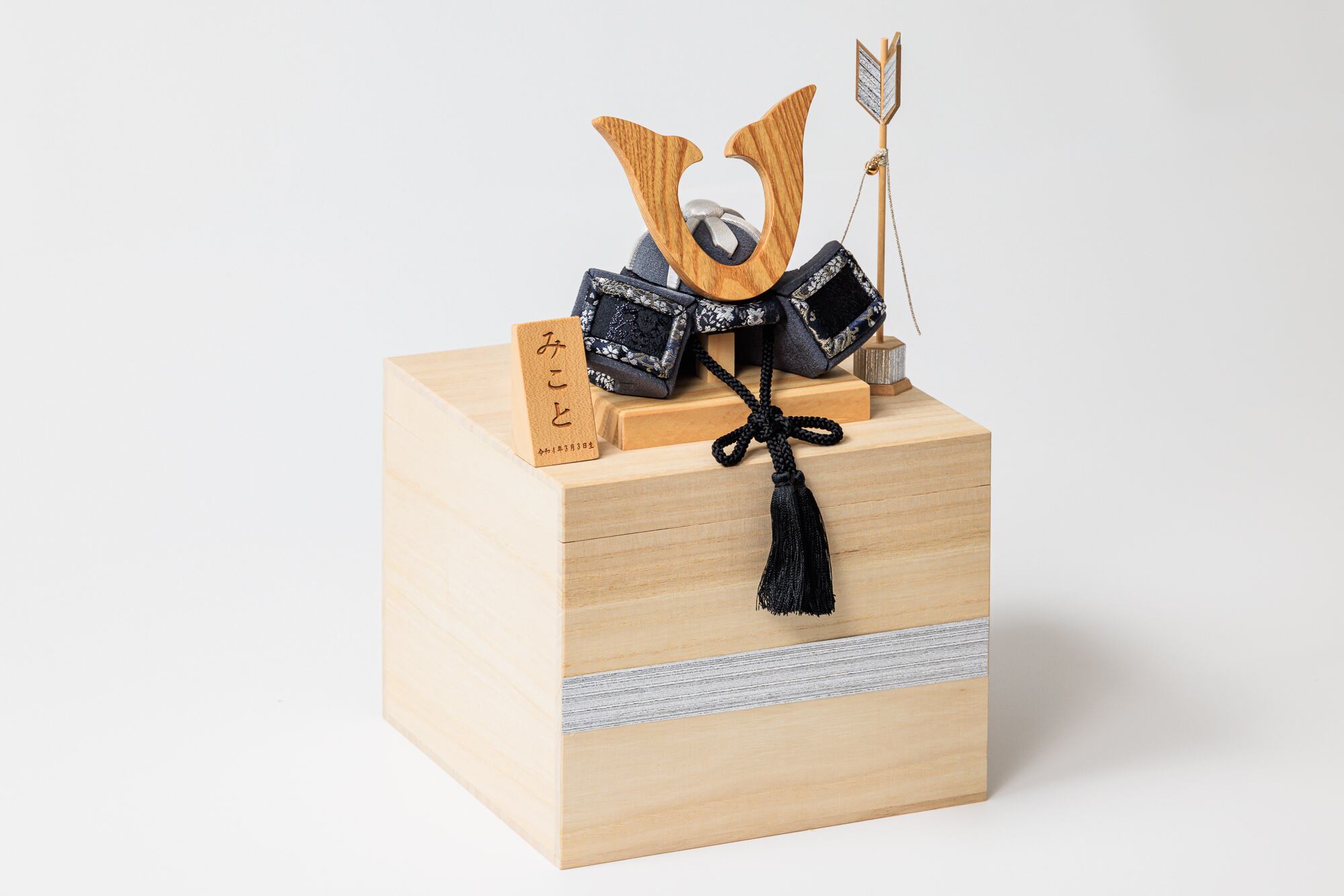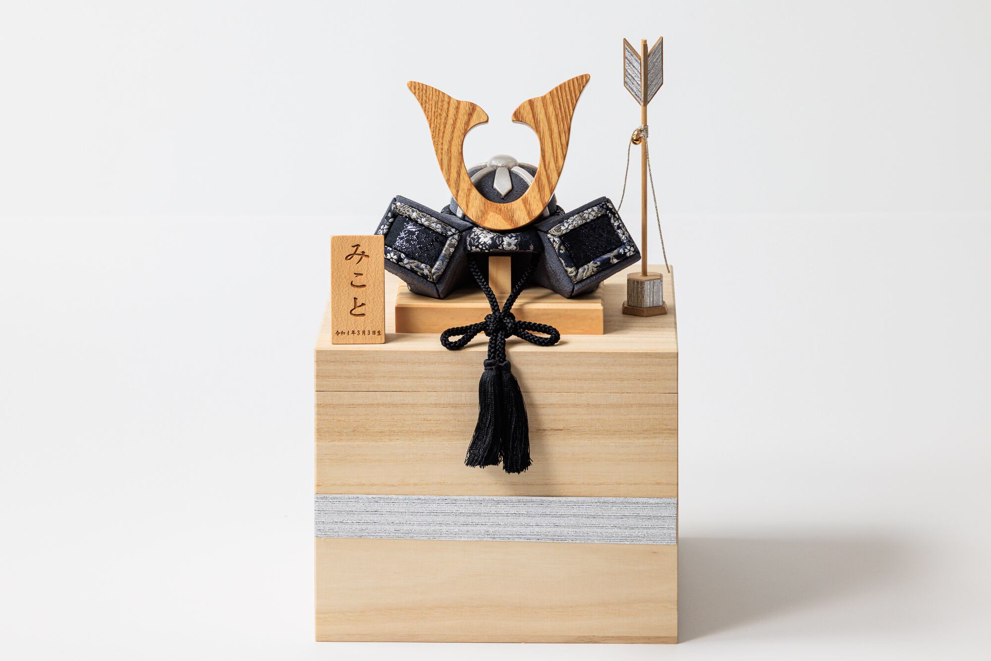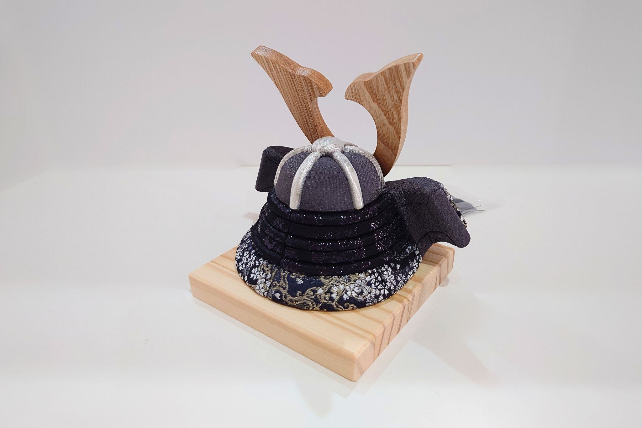 黒に煌めく装飾がついた木目込み兜はmikoto雛でしか扱っていない特別カラー